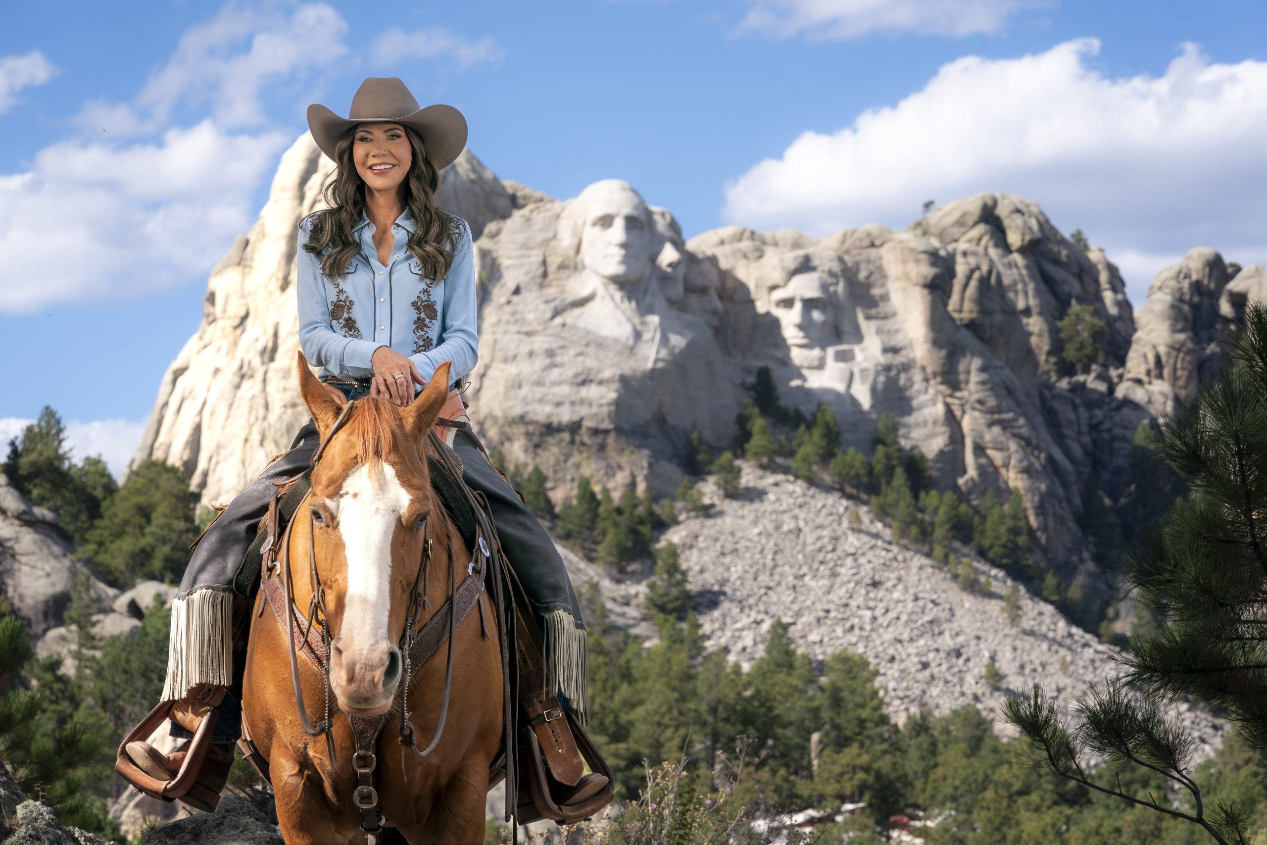 Secretary of Homeland Security Kristi Noem rides a horse while filming an ad at Mount Rushmore National Memorial in South Dakota, Oct. 2, 2025.  (DHS photo by Tia Dufour/Released)