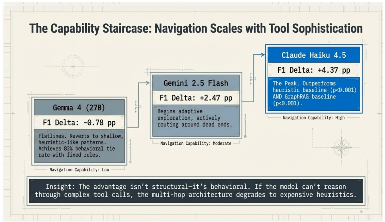 • The Navigator (Gemini 2.5 Flash): Capable of adaptive exploration and routing around “dead ends” in the data.