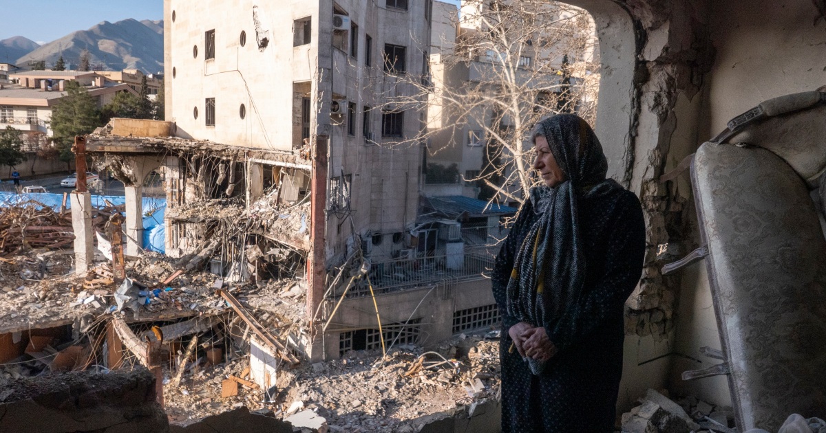 A woman looks out from her destroyed apartment in the remains of a residential and commercial building on March 21, in the Shahrak-e Gharb neighbourhood of Tehran, Iran. Majid Saeedi / Getty Images