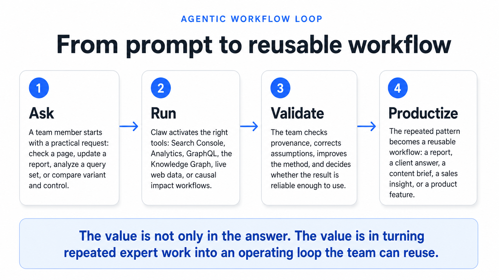Claw can call tools. It can retrieve data. It can use GraphQL. It can query Search Console. It can generate reports. It can produce artifacts. It can explain sources. It can compare variant and control groups.