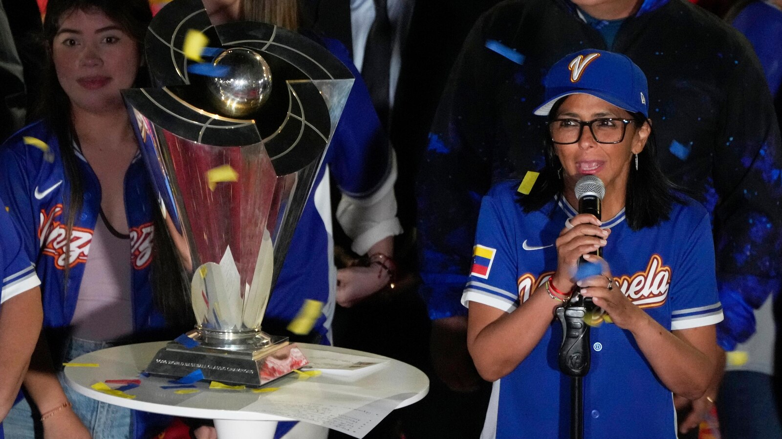 Venezuela’s acting President Delcy Rodriguez, right, speaks next to the World Baseball Classic trophy a day after her team’s victory over the United States in the championship match, at Miraflores presidential palace in Caracas, Venezuela, Wednesday, March 18, 2026. (AP Photo/Ariana Cubillos)